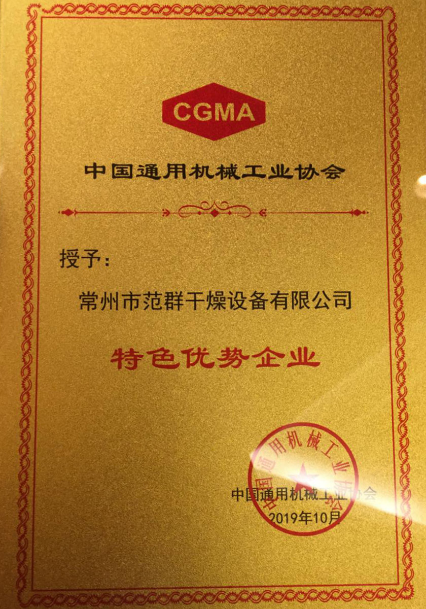 國際流體機械產業論壇旨在通過專業性、權威性的平臺,國際化的視野與角度讓企業捕捉到技術的方向、產品的未來、市場的趨勢,將知識轉化為生產力。中國通用機械工業協會授予常州市范群干燥設備有限公司2019年度中通協干燥設備特色優勢企業”。