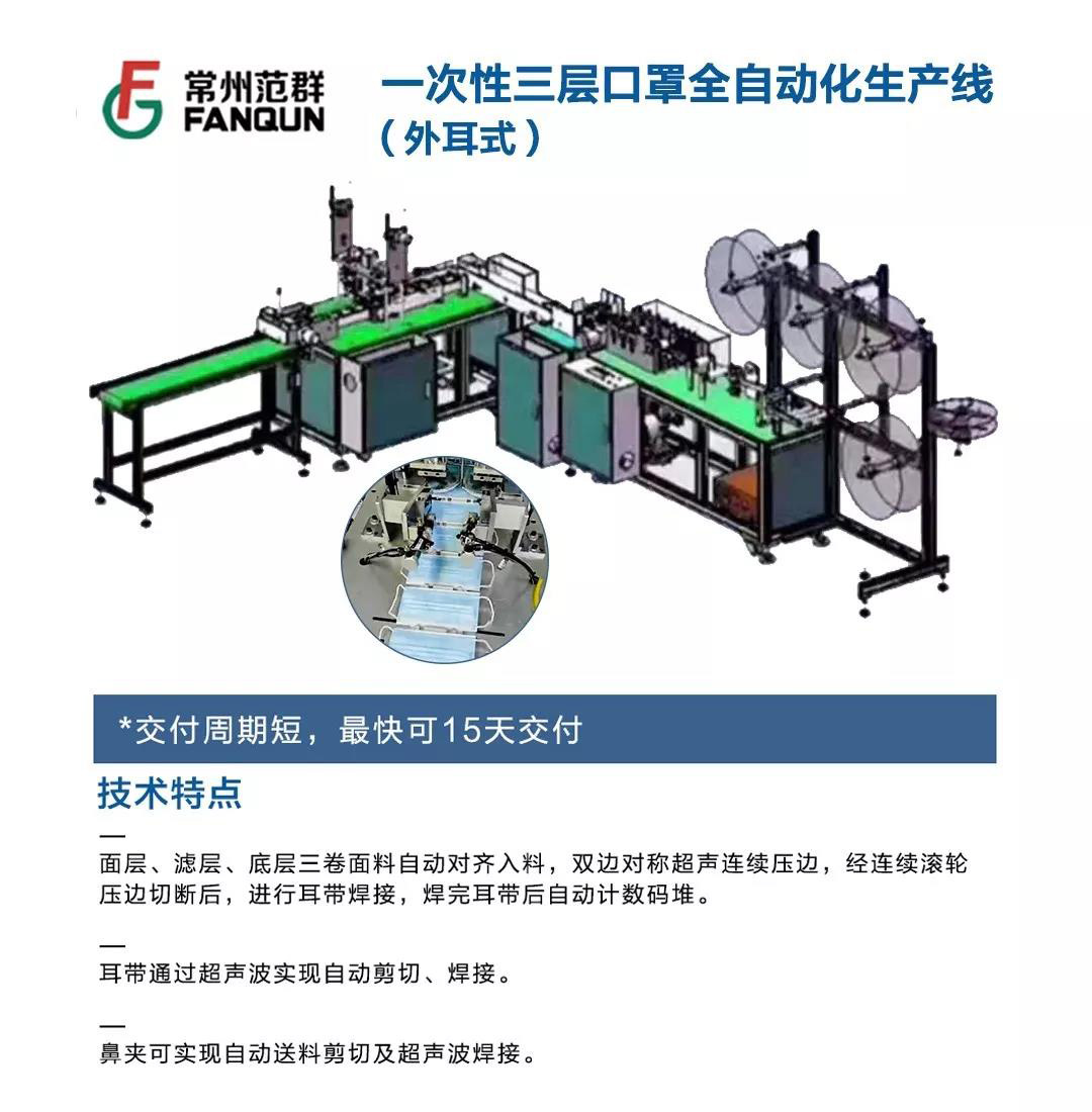 考慮到目前巨大的口罩需求矛盾,常州范群利用其自身的設(shè)備制造企業(yè)優(yōu)勢,在這個(gè)特殊時(shí)期,向客戶特別推出全自動(dòng)一次性三層口罩生產(chǎn)線(外耳式一拖一)和全自動(dòng)一次性三層口罩生產(chǎn)線(外耳式一拖二)兩款設(shè)備。以下為設(shè)備具體參數(shù)信息。
