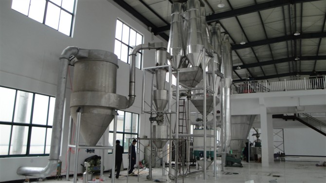 帶有粉碎機(jī)的氣流干燥裝置,是在氣流干燥管下面裝有一臺沖擊式錘磨機(jī),用以粉碎濕物料,減小粒徑,增加物料表面積,強(qiáng)化干燥。因此大量的水分在粉碎過程中得到蒸發(fā),在一般情況下,可完成氣化水分量的80%。這樣,便于采用較高的進(jìn)氣濕度,以獲得大的生產(chǎn)能力和高的傳熱效率。
